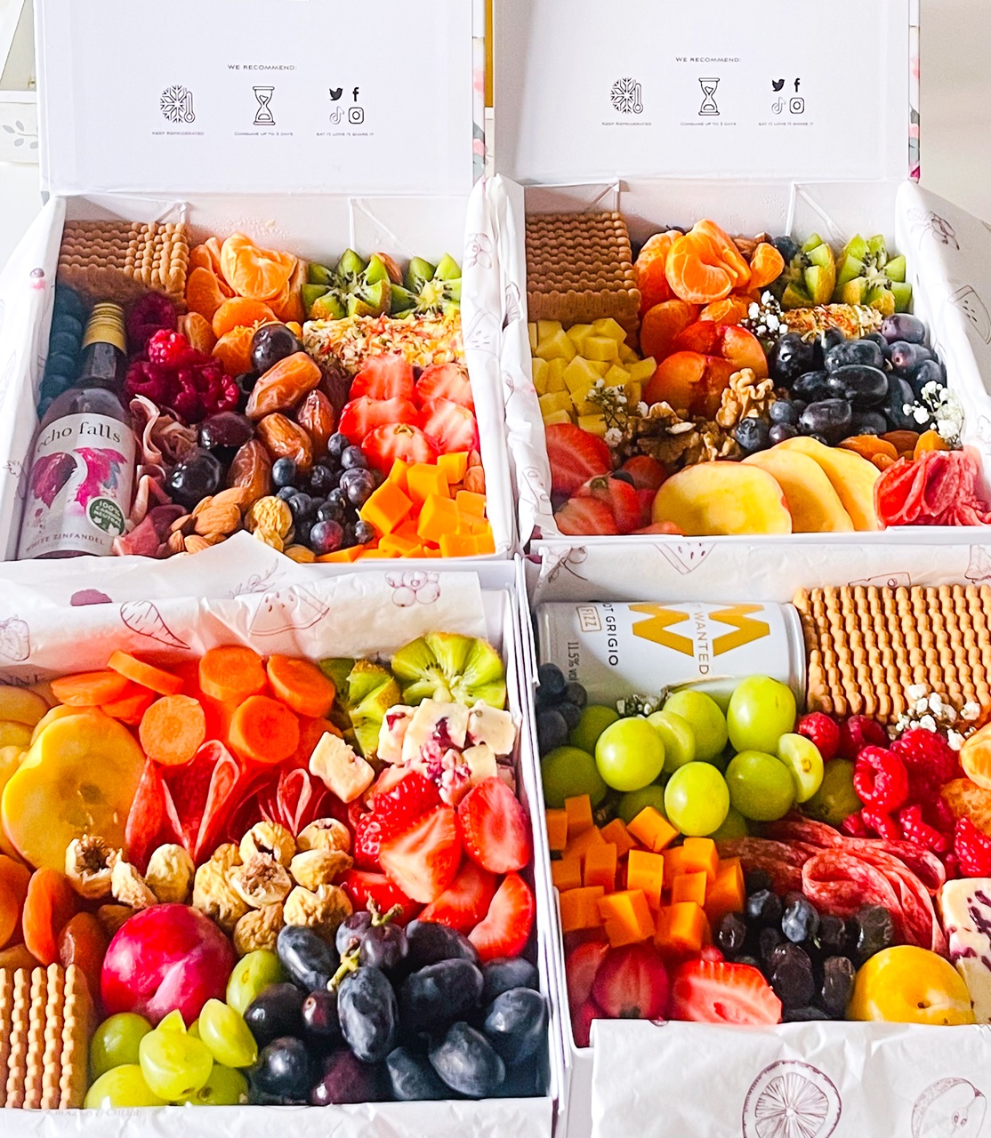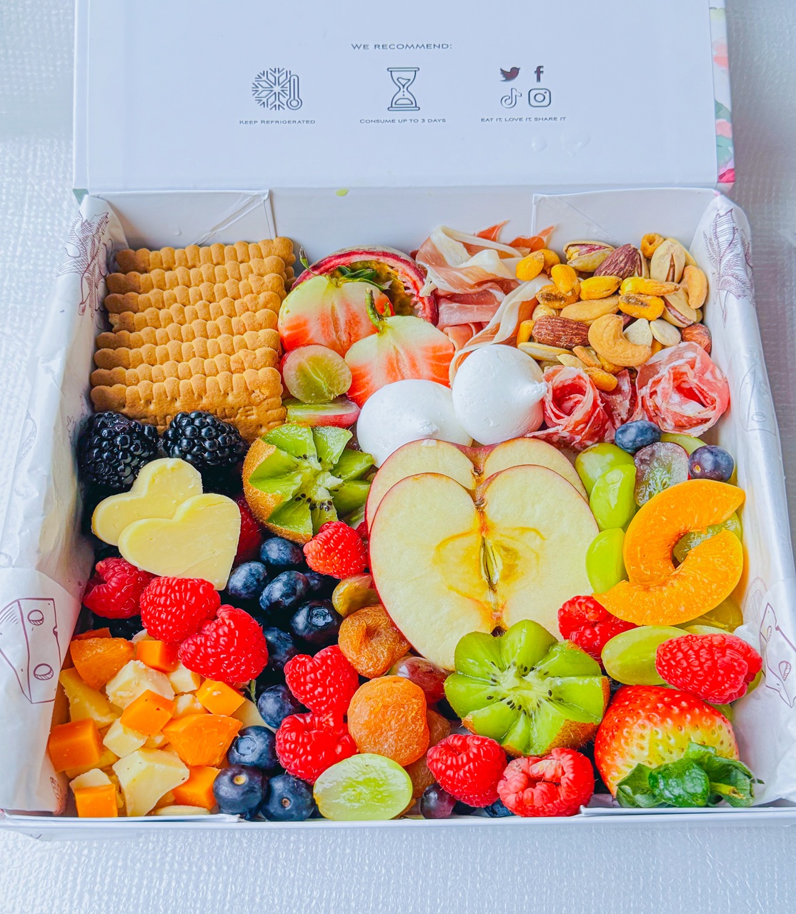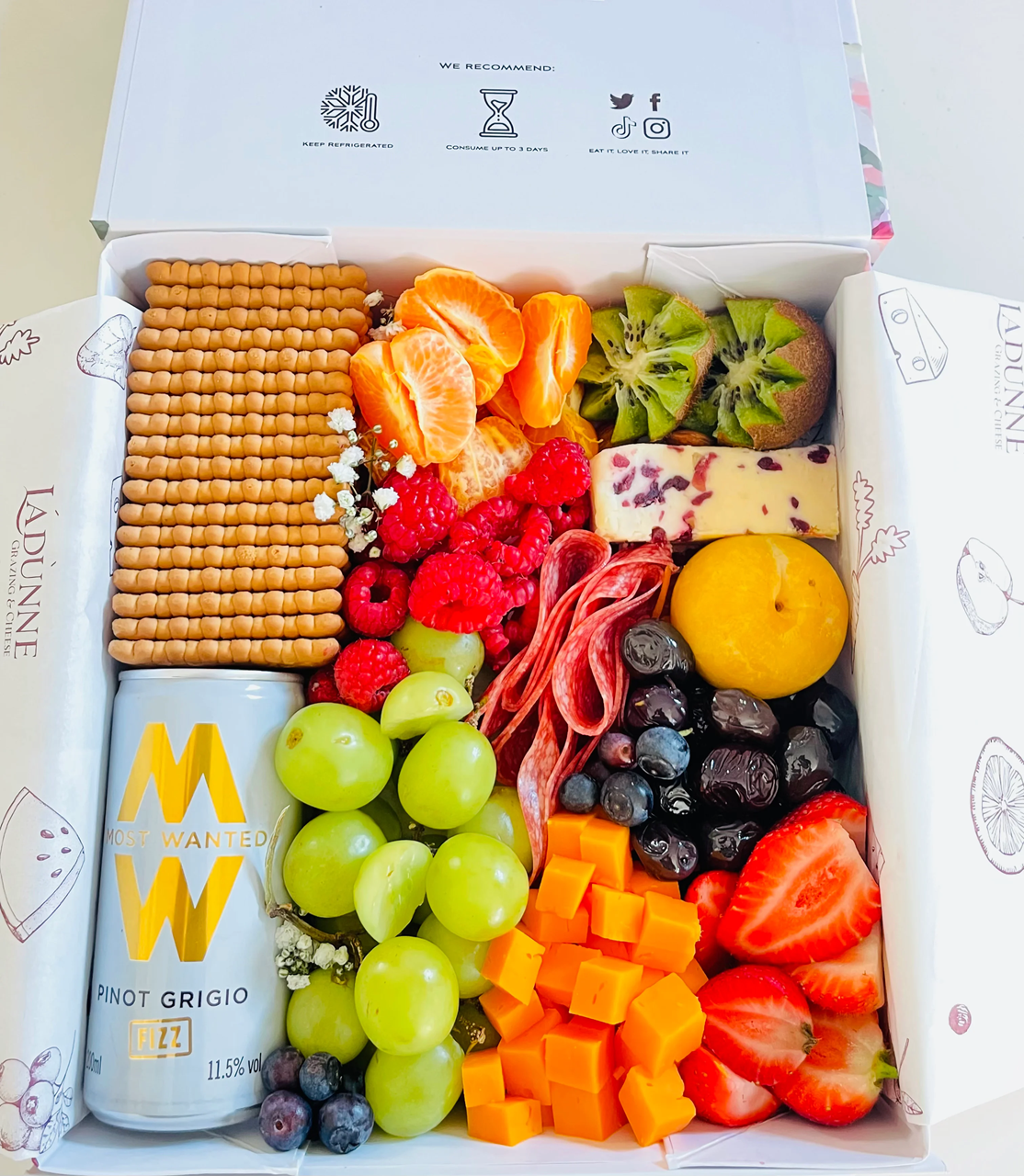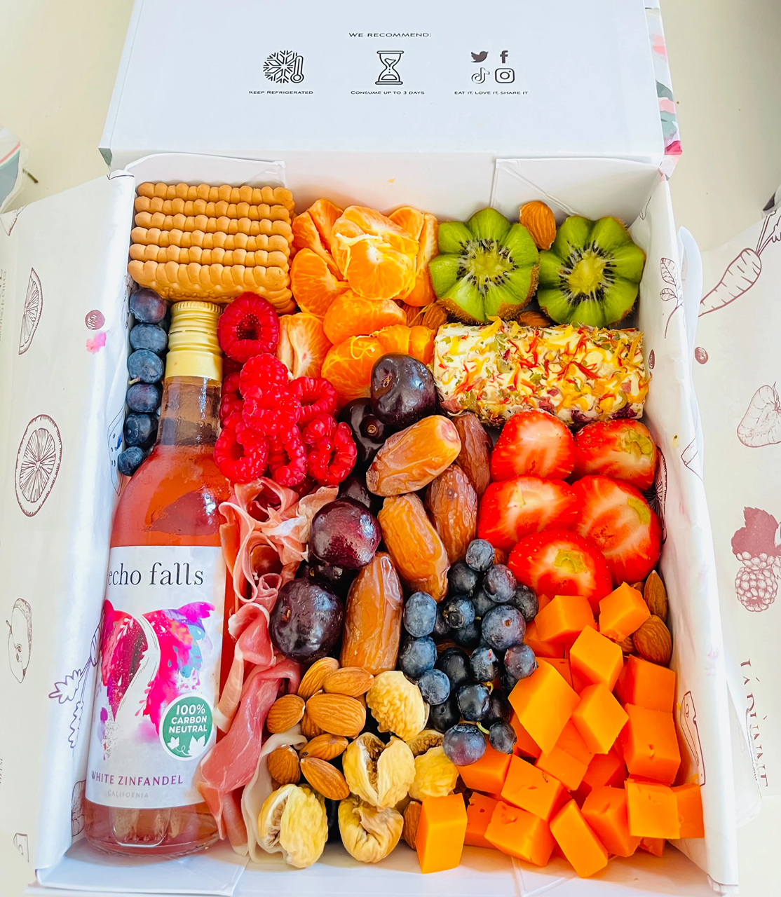 This graze box comes ready to eat straight from opening the box. Enjoy with your selection of wine pairing and relish in the fact that our team carefully put this box together specially for you and yours. Our graze box is best enjoyed on the day of receiving it, and if you have to refrigerate, please consume within two days of receiving it.