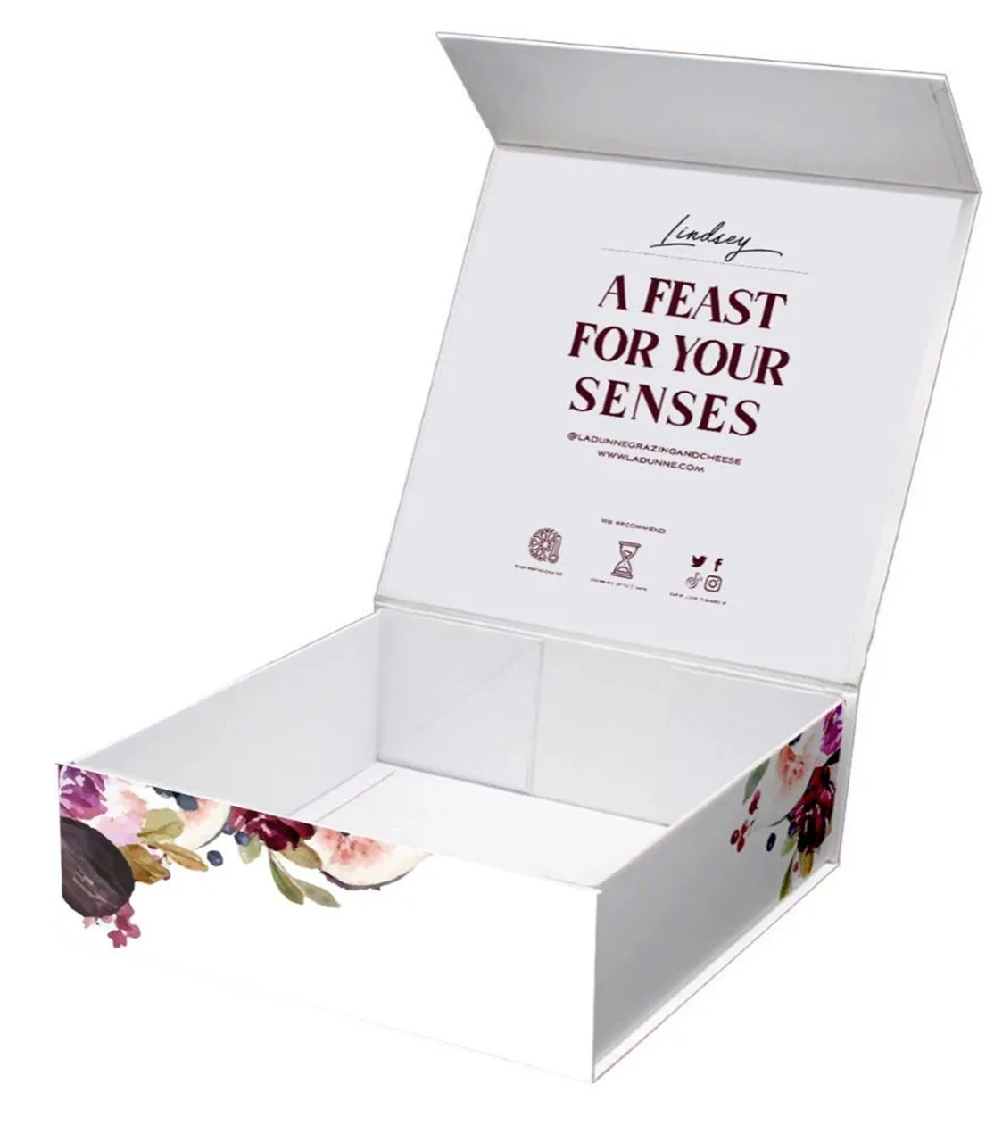 • Our Graze box feeds 3 – 5, and comes in a beautiful branded box that introduces you to the Ladunne experience. Flip open and marvel at the beautiful cheese, charcuterie and accoutrements arrangement, that is signature to us at Ladunne